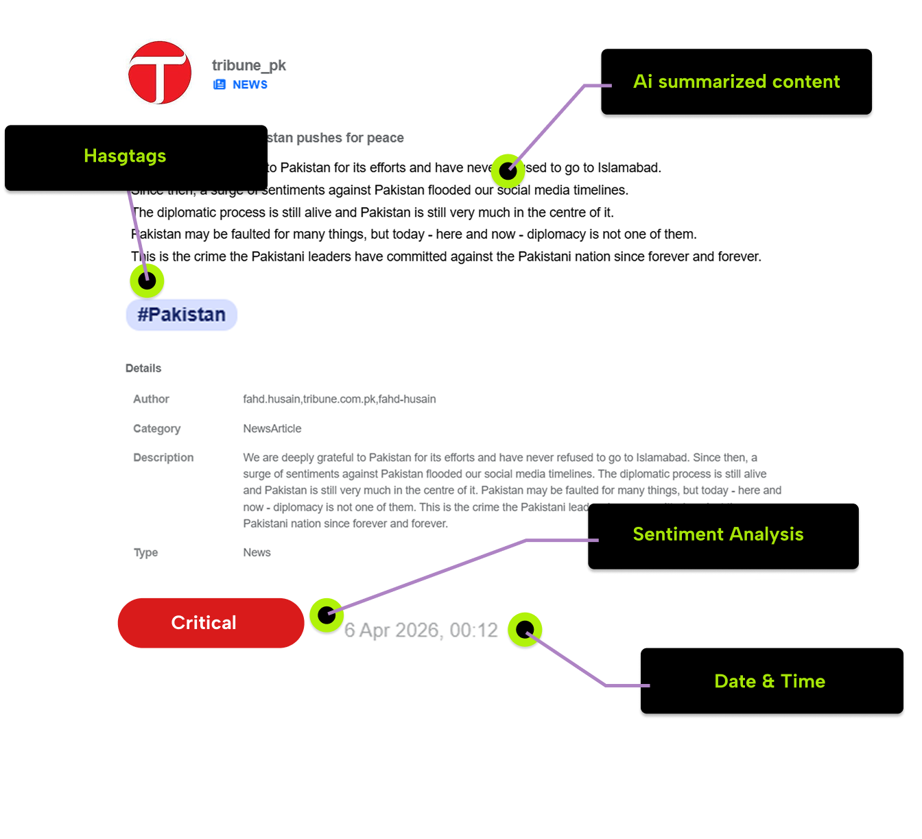 AI-powered sentiment analysis evaluates content in real time to identify tone and intent. It flags hate speech, critical narratives, and positive developments for better awareness. Enabling faster, more informed and balanced decision-making.